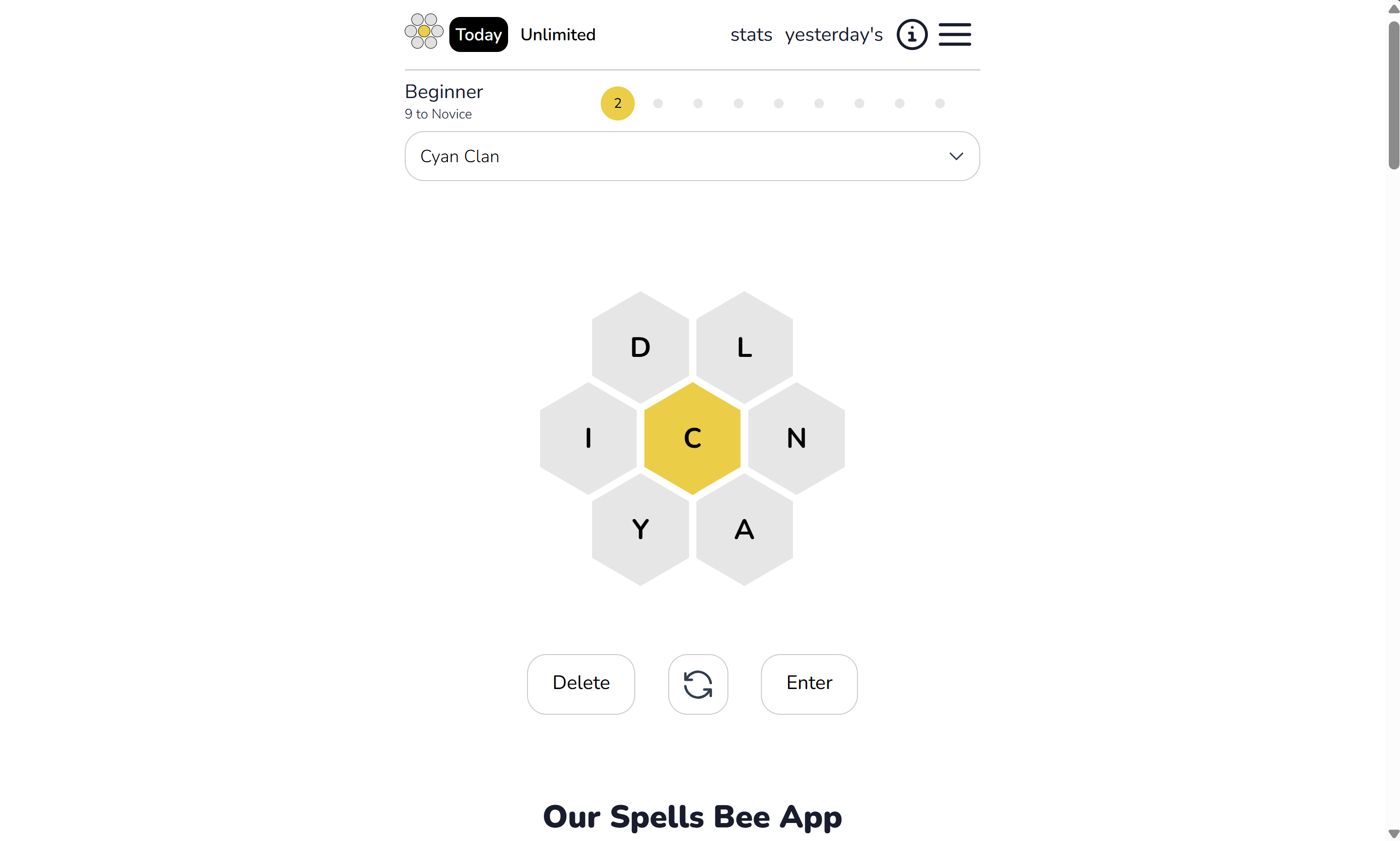 Spells Bee is a free online Spelling Bee game where you create as many words as possible from 7 given letters, always including the center letter. Each day brings a fresh puzzle, challenging you to discover new words, test your vocabulary, and find the elusive pangram-a word using all the letters for bonus points. The simple yet addictive gameplay is perfect for quick breaks or longer sessions, making it an ideal destination when you're bored and looking for a fun mental workout. Spells Bee not only entertains but also sharpens your spelling, memory, and cognitive skills, offering unlimited daily puzzles and a friendly, intuitive interface. Whether you’re a word game enthusiast or just looking to pass the time productively, Spells Bee is the go-to website for engaging, brain-boosting fun!