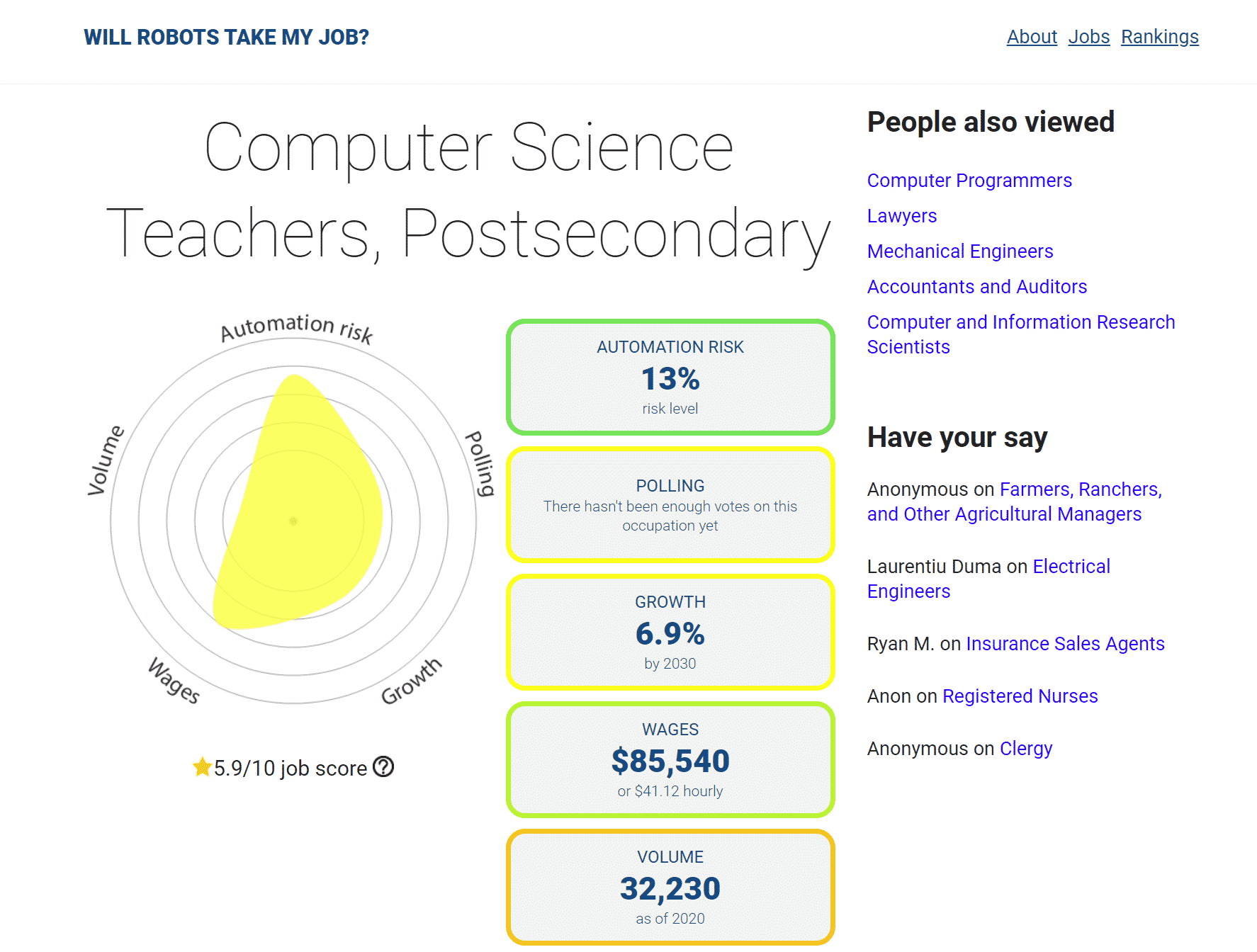 Will Robots Take My Job? is an interactive website that lets you instantly check how likely your job is to be automated by robots or artificial intelligence. Just type in your occupation and the site reveals the probability of automation, along with extra details like projected job growth, median salary, and current employment figures. Built on data from a widely-cited Oxford University study, it covers hundreds of professions, ranking them from “totally safe” to “you are doomed”.